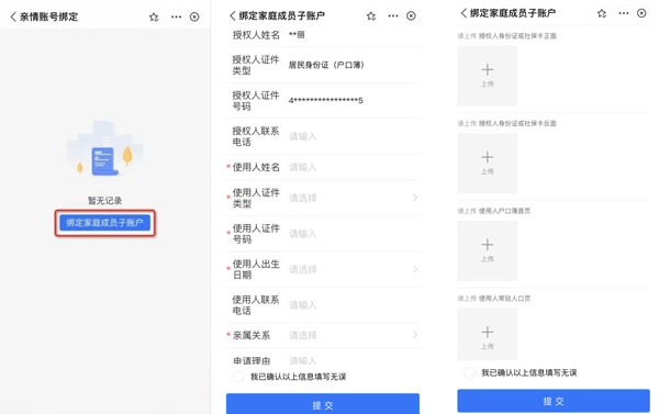 步骤2:进入【亲情账号绑定】界面,点击“绑定家庭成员子账户”,填写信息,上传材料,点击“提交”。