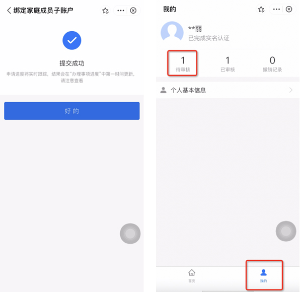 步骤3:“提交成功”后,由地市医保经办机构进行审核。参保人可在“我的”—“办理事项”中查询审批状态。