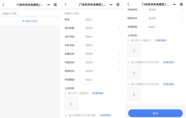 步骤3:进入【亲情账号绑定/解绑】业务办理界面后,点击“添加共济关系”按钮,依次填写要绑定人员信息,上传相关材料,点击“提交”按钮即可完成绑定申请。