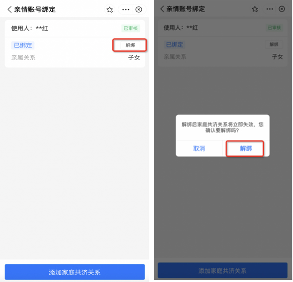 步骤2:进入【亲情账号绑定】业务办理界面后,选定需要解绑的关系人,点击关系人旁的“解绑”按钮,弹出解绑提示,点击“解绑”即可解绑成功。