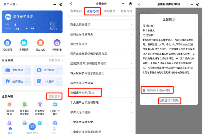 步骤1:参保人可登录“粤医保”微信小程序,在【查看更多】—【业务办理】—选择【亲情账号绑定/解绑】;页面弹出“温馨提示”后请仔细阅读,勾选【已阅读以上信息并同意】,最后点击“我已阅读并同意”按钮。