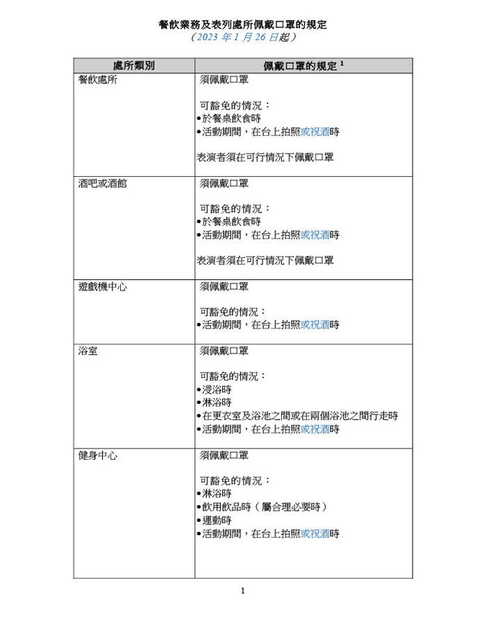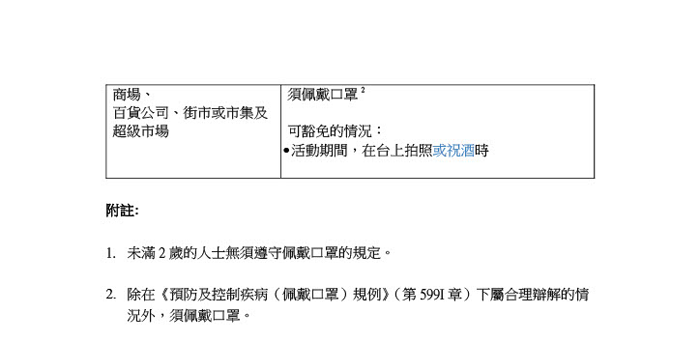 在餐饮处所或任何表列处所内,于活动期间在台上祝酒时,都可豁免佩戴口罩。