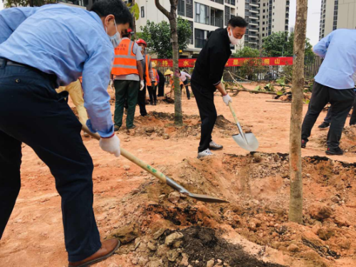 在番禺区南大干线智联带状公园义务植树活动现场,全体参与人员拿起工具,撸起袖子,扶正树苗、挥锹铲土、三人一组、五人一队、有序分工,默契配合,现场呈现一派热火朝天的劳动场面。经培土、种植、压实、支撑、浇水等工序,种下了细叶榕、高山榕、樟树、柚木、桂木、人面子、木棉、凤凰木、宫粉紫荆、黄花风铃木等硬材质、常绿或开花树种约640 株。