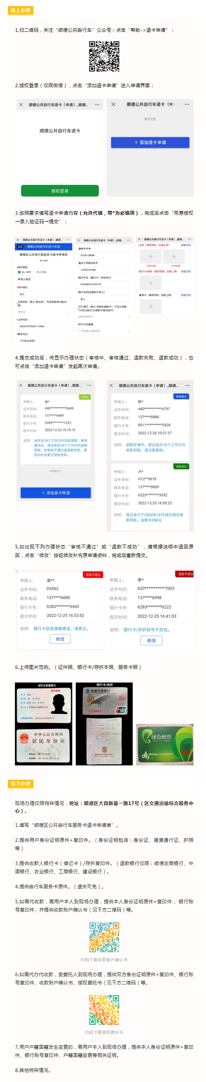 区交通运输局发布,自2023年1月1日起,凡需办理退卡业务的市民,可通过“顺德公共自行车”微信公众号的“退卡申请”功能在线办理退卡手续,办理退卡时间截至2023年12月31日止,逾期未办者将视为放弃,并将未退卡的保证金、充值余额等统一上缴财政。请各位市民按期办理。