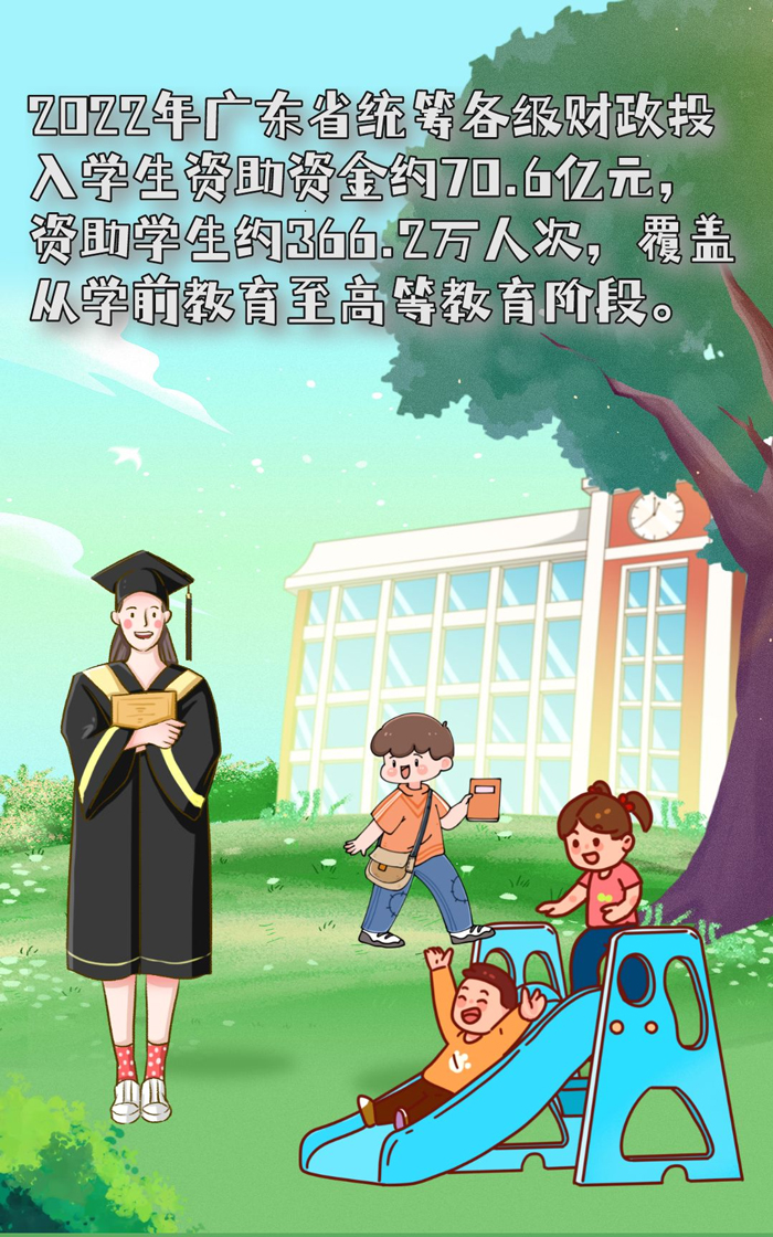 2022年广东省统筹各级财政投入学生资助资金约70.6亿元,资助学生约366.2万人次,覆盖从学前教育至高等教育阶段,其中: