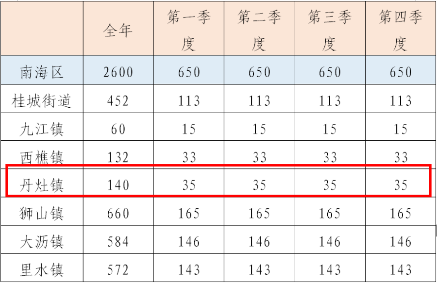 南海区2022年积分入户指标数共2600个,根据2021年各镇(街道)的积分入户申请总数按比例按季度分配,丹灶镇占有140个。如下图:
