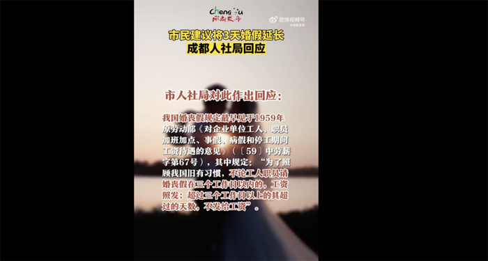 据@成都发布 消息,近日,有四川成都市民留言称,“成都市婚假只有3天,时间太短,其他部分省市都修订了婚假,成都市能否延长婚假?”