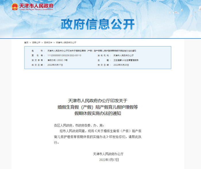 天津政务网发布的《关于婚假生育假(产假)陪产假育儿假护理假等假期休假的实施办法》规定:依法办理结婚登记的公民,享受婚假十日。