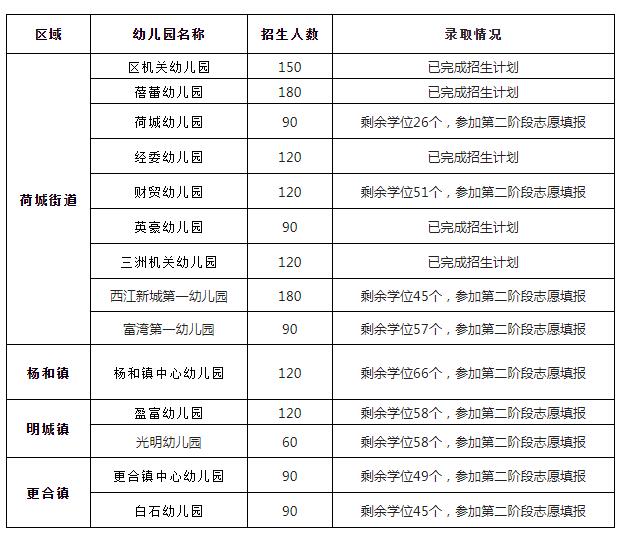 按照招录工作日程,还有剩余招生计划的9所幼儿园将于3月28-29日进行志愿填报,3月31日进行第二阶段电脑随机摇号录取。所有符合报名条件但第一阶段未被录取的儿童和直系亲属在报读幼儿园所在镇(街道)有住房的适龄儿童均可自愿选择报读第一阶段招生未满的公办幼儿园。