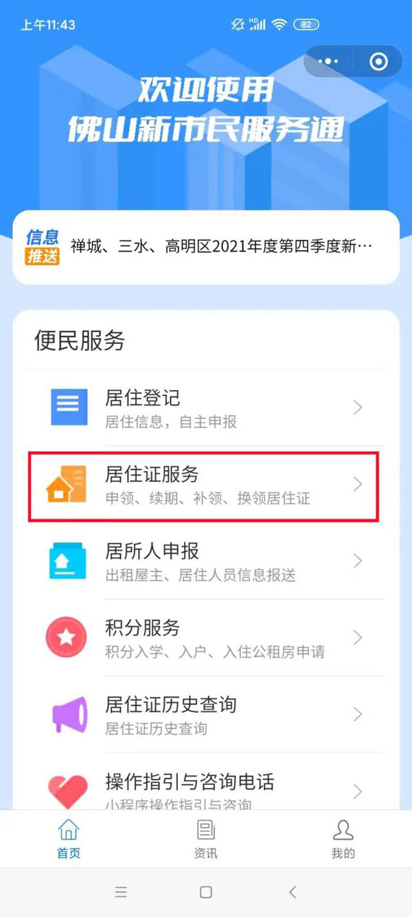 (二)线上申请:进入微信小程序“佛山新市民服务通”点击居住证服务办理。