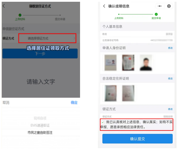 若信息有变更,则需根据小程序提示进行操作,返回进行“居住登记”。完成后,在“领取居住证方式”栏选择“市民之窗自助签注”。