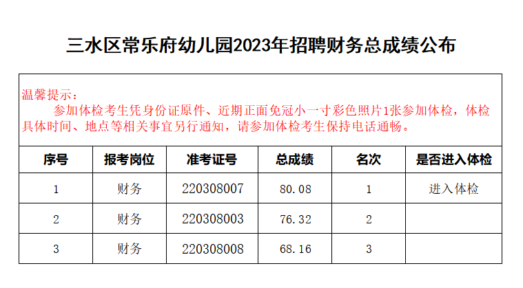 根据《佛山市三水区常乐府幼儿园财务招聘公告》的相关要求,三水区常乐府幼儿园2023年面向社会公开招聘财务面试工作已经完成。现将应聘人员的总成绩及进入体检人员名单进行公示。