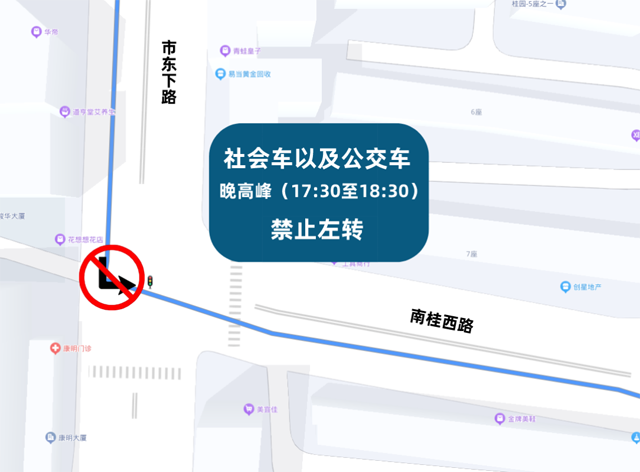 由于市东路由2023年3月1日起实施新的交通管制:晚高峰(17:30至18:30)市东路-南桂路北进口社会车以及公交车全部禁止左转进入南桂西路。公交G7、176 、208、232B线路从2023年3月1日起晚高峰(17:30至18:30)实施临时绕行,敬请市民留意,提前调整出行安排!具体如下:
