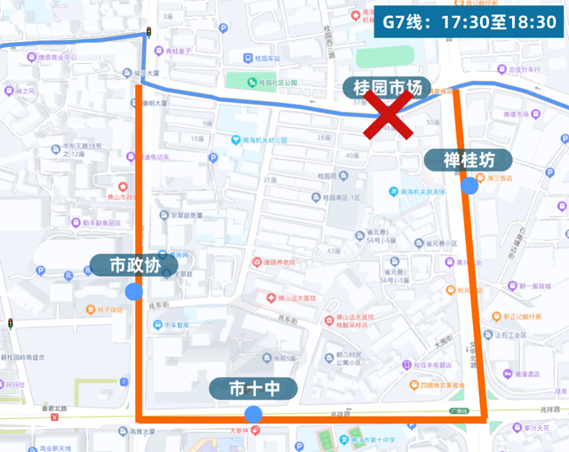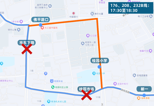 往桂城益禾公寓(176线)、和桂工业园A区(208线)、芳村客运站总站(232B线)方向,取消行驶市东下路、南桂西路部分路段(市东路至文华路段),绕行佛平路、文华北路后接回原线行驶。