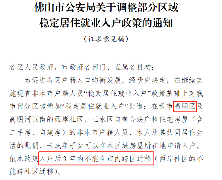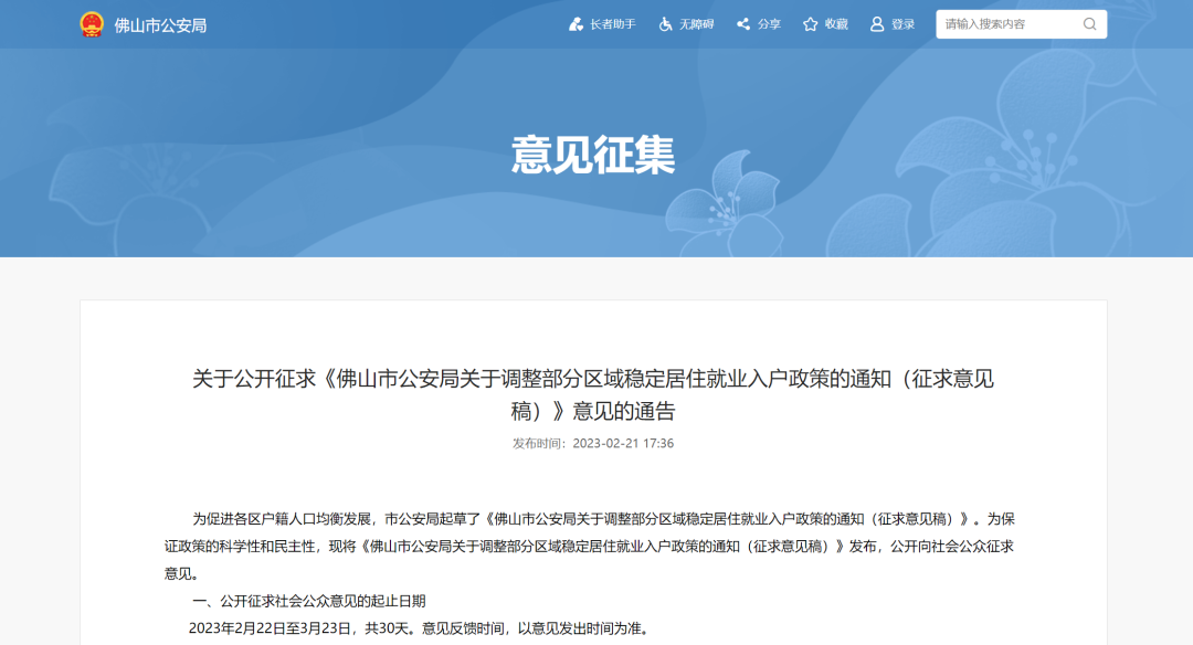 2月21日,佛山市公安局发布了关于公开征求《佛山市公安局关于调整部分区域稳定居住就业入户政策的通知(征求意见稿)》意见的通告,并公开向社会公众征求意见。