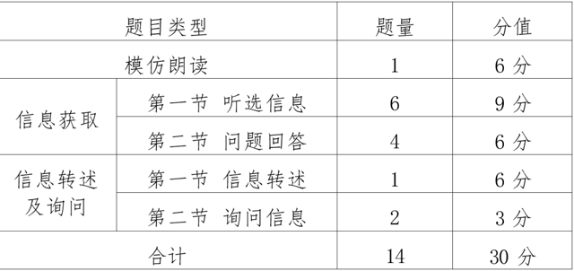考试采取“人机对话”形式进行,共三大题,满分为30分。试卷结构如下表: