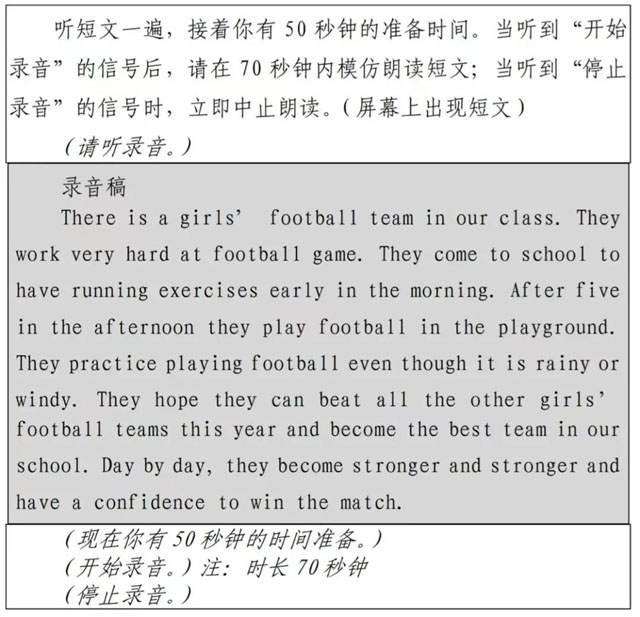 考生听短文,感知和理解说话者表达的意义、意图和态度,然后模仿朗读。