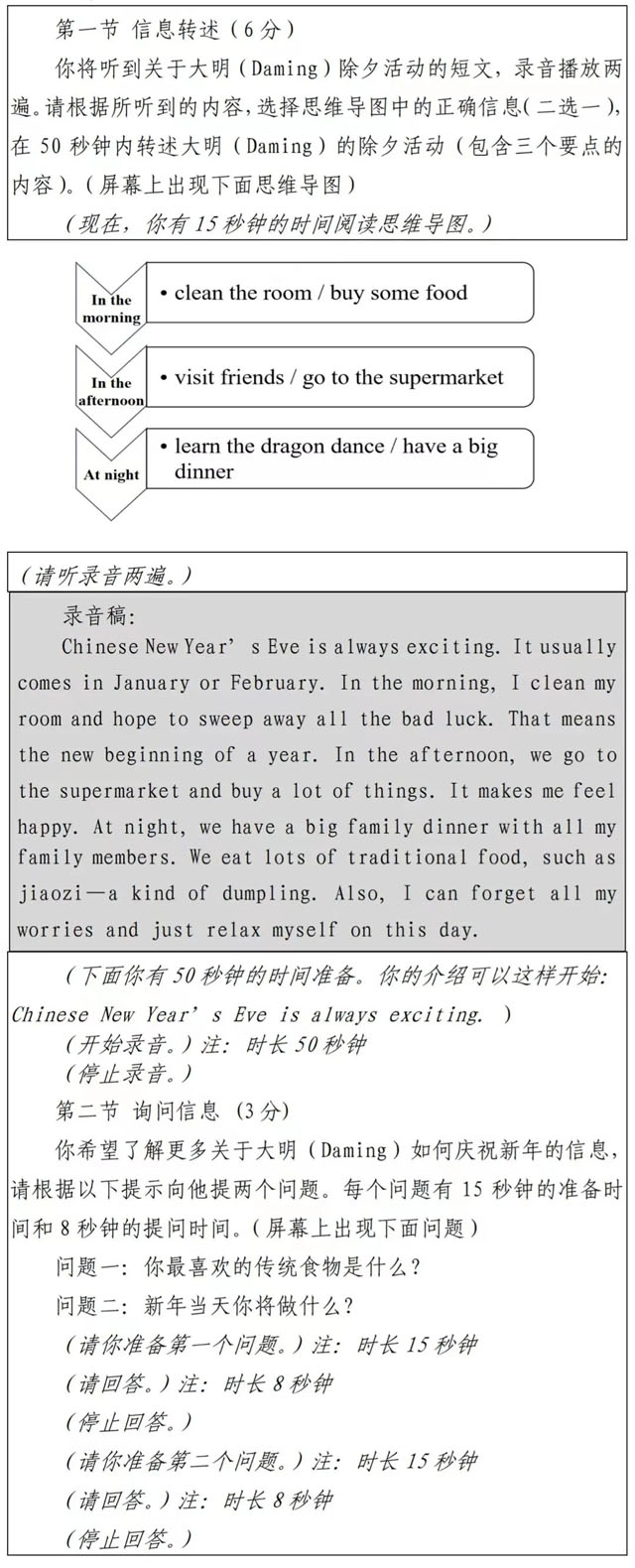 考生在听的过程中,从思维导图或图表的选项里选出正确的信息,然后转述语篇内容。转述后,根据提示口头提出两个问题。