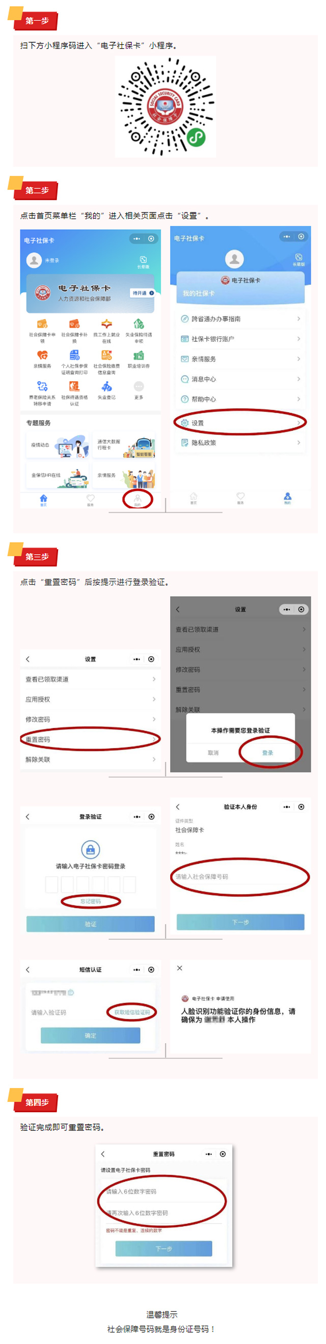 电子社保卡申领渠道上均提供了电子社保卡密码修改及重置功能,在渠道上打开电子社保卡密码修改窗口,填写原密码及新密码后即可修改。如忘记密码可进行密码重置,密码重置前需进行认证操作,采用手机短信认证或银行认证通过后即可重置密码。