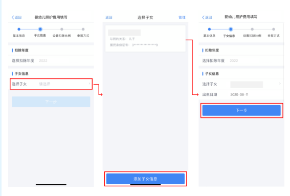 纳税人选择子女后,将回到“子女信息”界面,并显示子女的姓名与出生日期,子女信息确认无误后,点击“下一步”。