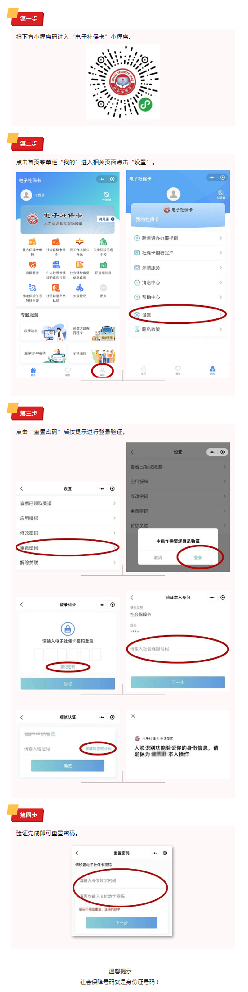 电子社保卡申领渠道上均提供了电子社保卡密码修改及重置功能,在渠道上打开电子社保卡密码修改窗口,填写原密码及新密码后即可修改。如忘记密码可进行密码重置,密码重置前需进行认证操作,采用手机短信认证或银行认证通过后即可重置密码。