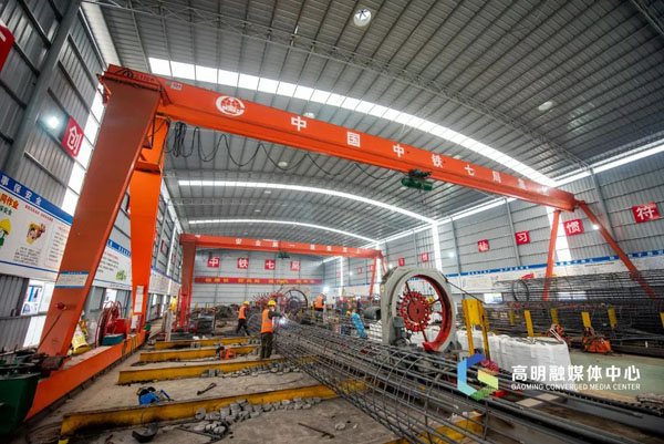 珠肇高铁高明段的钢筋厂内,一片繁忙景象。