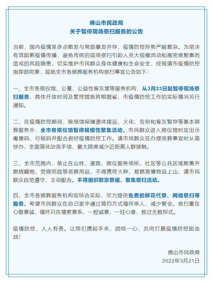 →→ 佛山从3月23日起暂停现场祭扫服务 ←←