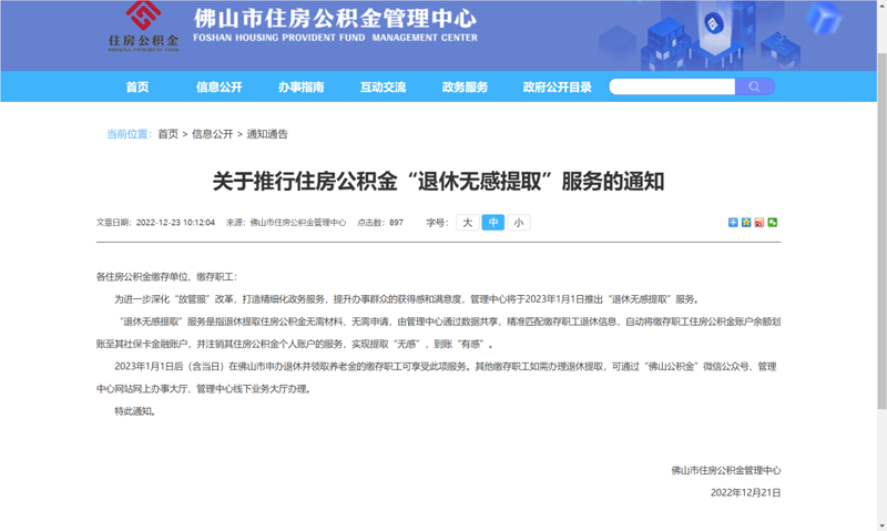 其他缴存职工如需办理退休提取,可通过线上途径“佛山公积金”微信公众号或管理中心网站网上办事大厅办理,也可预约至管理中心线下业务大厅办理。