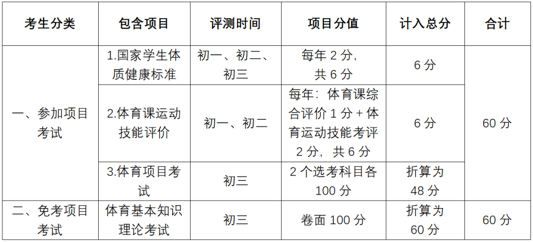 参加体育理论考试的考生,按卷面分值(满分100分)的60%折算计入中考总分,这部分学生的《国标》和《体评》测试成绩不纳入分值范围。