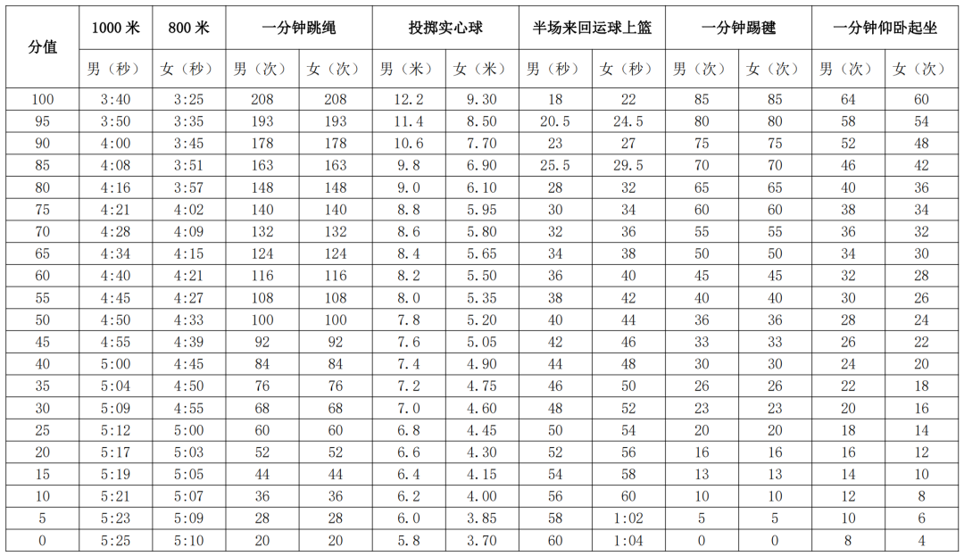 取消统一测试必考项目(男子1000米跑/女子800米跑),将原必考项目调整为选考项目,即我市统一测试选考项目库由原来的12项调整为13项。学生可从选考项目库中任意选取2项进行统一测试计分。