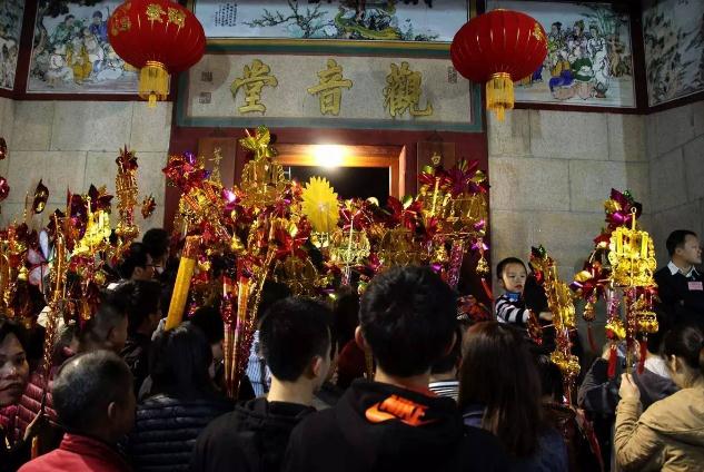观音是顺德人广泛信仰的神灵,自宋代起当地便有容桂观音堂、龙江紫云阁等祀奉观音的庙宇,当地的观音信俗以每年农历正月廿六日的观音开库系列民俗活动为代表。传说正月廿六日是观音每年查点钱库的日子,子时会大开金库贷款助民,当地民众到观音庙虔诚祈祷并进行借库还库、烧大炮、生菜会等系列民俗活动,祈求财运畅通。清中后期, “正月观音宝库开”的盛典便屡见于顺德人的诗歌中。