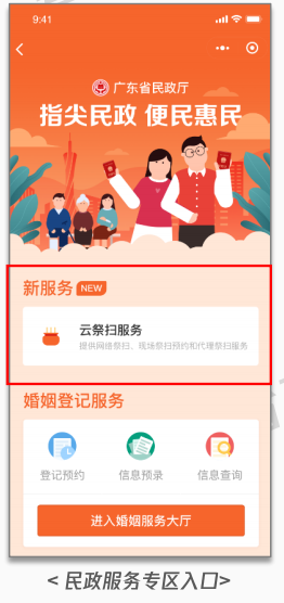 方式二:微信搜索登录“粤省事”小程序,进入“专区”,选择“民政服务专区”,选择“云祭扫服务”办理相关服务。
