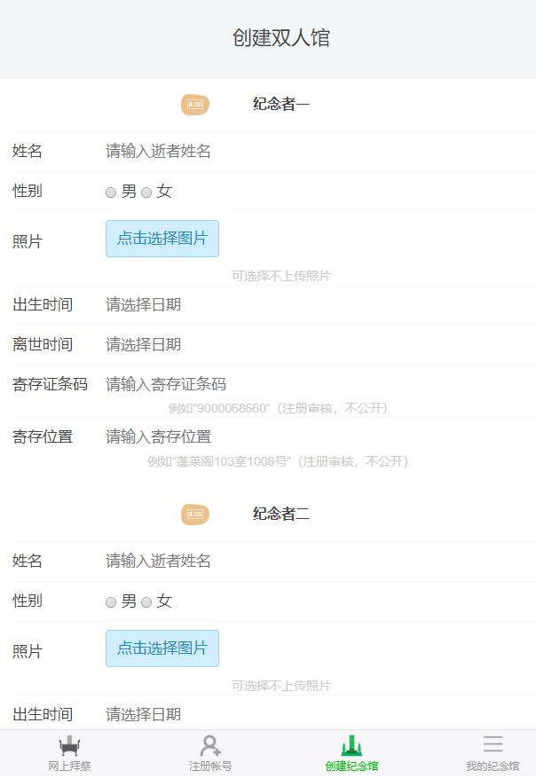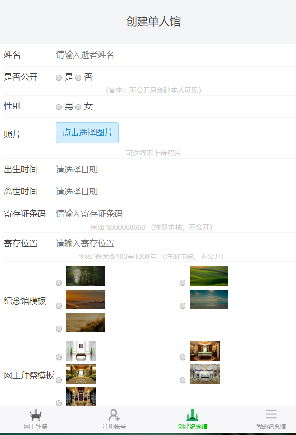 第四步:创建纪念馆,录入信息时需认真对照“骨灰寄存证”,准确填写每项内容,若信息有误,审核将无法通过。
