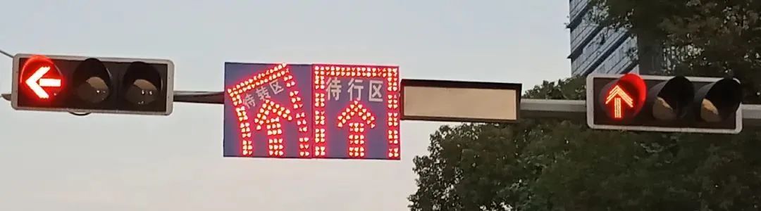 当信号灯为红灯,待行区显示屏为红色停止线和红色箭头时,车辆不得进入待行区,须在所在车道停止线内等候。