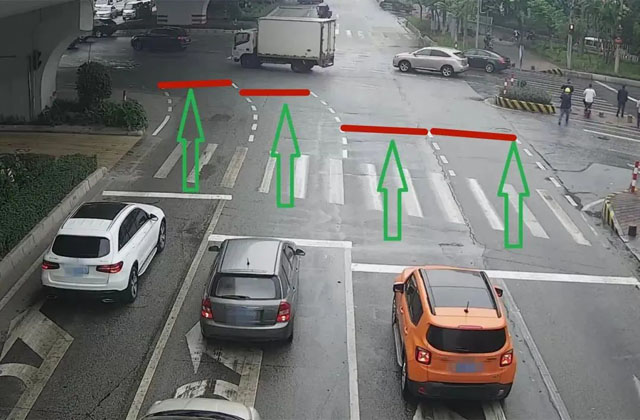 现阶段可变车道的运行模式:雷达实时监控,在左转车道排队车辆超过一定长度时,而且可变车道已排空的情况下切换成左转车道,当左转和可变车道都排空后恢复直行车道。