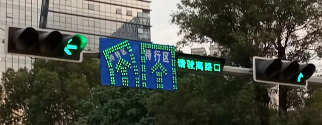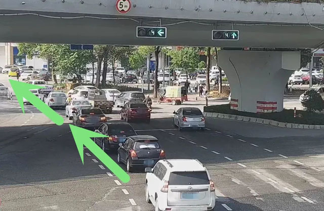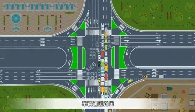 当信号灯为绿色,待行区显示屏为绿色停止线和绿色箭头时,车辆均可通过路口。