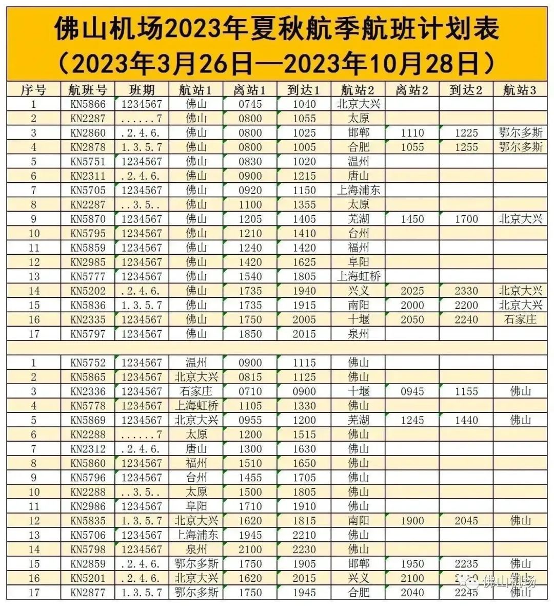 2023年夏秋航季将于3月26日正式开启。佛山机场结合变化及旅客需求,周密部署换季航班,进一步完善国内网先网络布局,计划新增、恢复佛山=唐山、佛山=台州、佛山=合肥=鄂尔多斯、佛山=兴义=北京大兴等航线,更好满足广大市民出行需求。