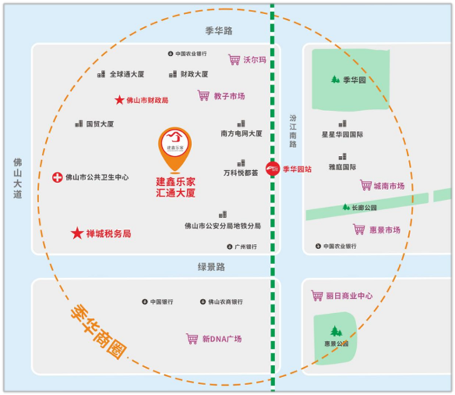 汇通大厦位于佛山市禅城区影荫路6号,地理位置优越,距离广佛线季华园地铁站约100米,交通出行便利,周边有沃尔玛超市、王府井、创意产业园等商圈,还有季华园,生活配套成熟且居住氛围浓郁。