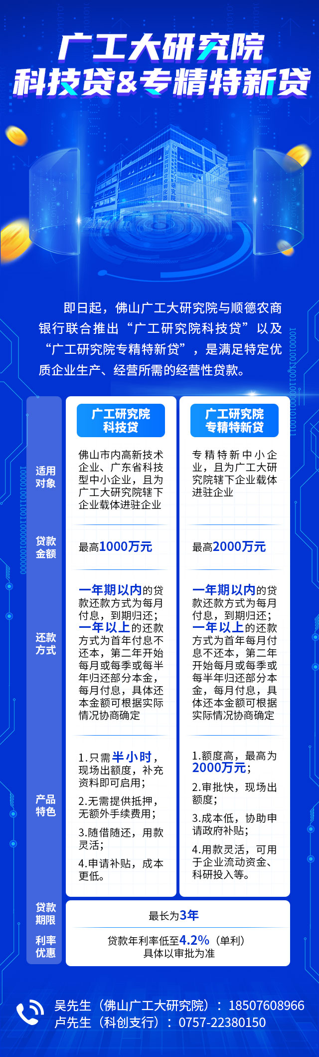 好消息!即日起,由佛山市南海区广工大数控装备协同创新研究院(下称“佛山广工大研究院”)与顺德农商银行共同开发的“广工研究院科技贷”和“广工研究院专精特新贷”两款专属融资产品正式落地,符合条件的企业可按需申请。