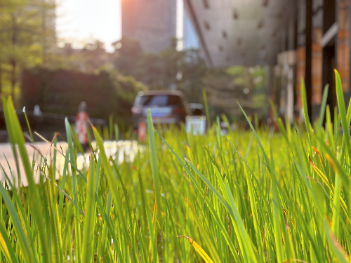 记者现场看到,菖蒲围着大厦四周种植,绿意盎然,和周边的城市景观和背后的大厦玻璃幕墙形成强烈反差。时而微风袭来,“水稻”随风摆动,在夕阳下闪烁着金灿灿的光芒。