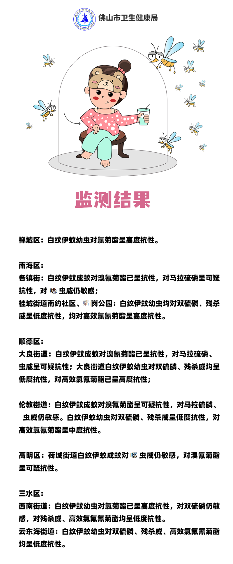为巩固国家卫生城市创建成果,科学防控登革热、基孔肯雅热等蚊媒传染病,为正确选择和合理使用卫生杀虫剂提供依据,2022年,佛山市疾控中心在省疾控中心、市爱卫办的指导下,组织各区疾控中心开展白纹伊蚊幼虫和成蚊抗药性监测。