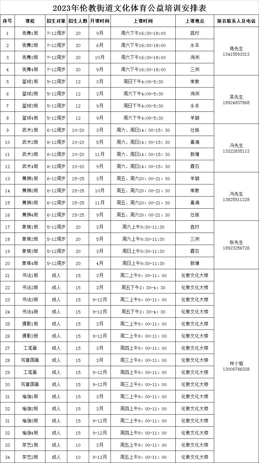 为进一步推动伦教街道文体事业发展,深化新时代文明实践活动,大力丰富伦教街道广大市民文化体育生活,利用协会资源/发挥会员特长,2023年,伦教将在街道文化站、新时代文明实践所及各村(社区)新时代文明实践站开展各项文体公益培训。