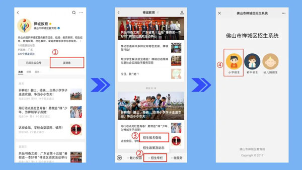通过关注“禅城教育”微信公众号(微信号:fs_ccjy)→底部子菜单的“招生专栏”→选择“招生报名查询”,进入“佛山市禅城区招生系统”→点击“小学招生”。