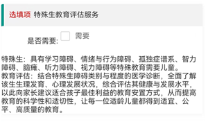 选择了需要“特殊生教育评估服务”的学生,后续将会有教育局派出的专业老师联系家长进行教育评估服务,此项服务为免费服务。