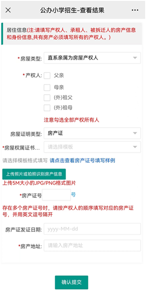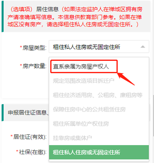 注意:“申请入学类型”选择“政借生1-17条”的,若父母在禅城区拥有房产的,可在“居住信息”栏填写房产相关信息。(此项为选填项。本信息供教育部门参考。如果在禅城区没有房产,请选择“租住私人住房或无固定住所”。)