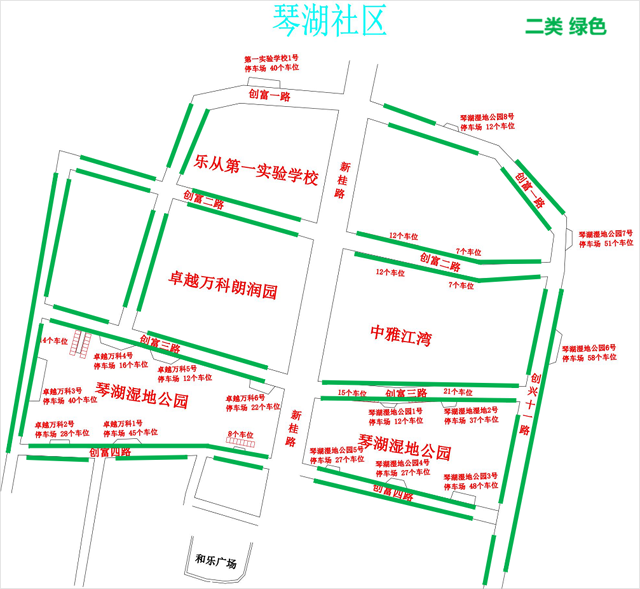 第一实验学校1号停车场,卓越万科1、2、3、4、5、6号停车场,琴湖湿地公园1、2、3、4、5、6、7、8号停车场。