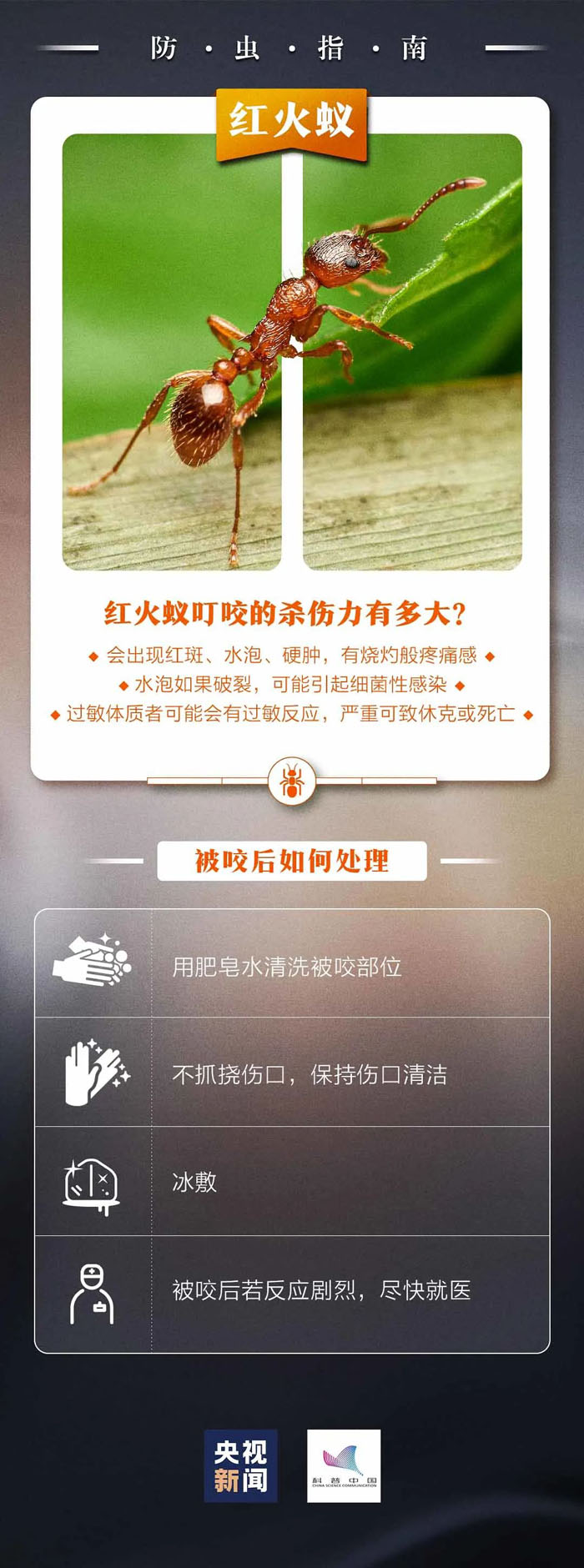 红火蚁体型长度约为3-7毫米,它的毒囊中有大量毒液,一旦人或动物被蜇伤,毒液就会注入皮肤,产生如火灼伤般的疼痛感。