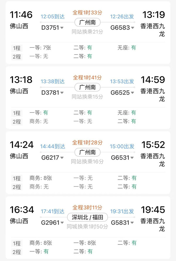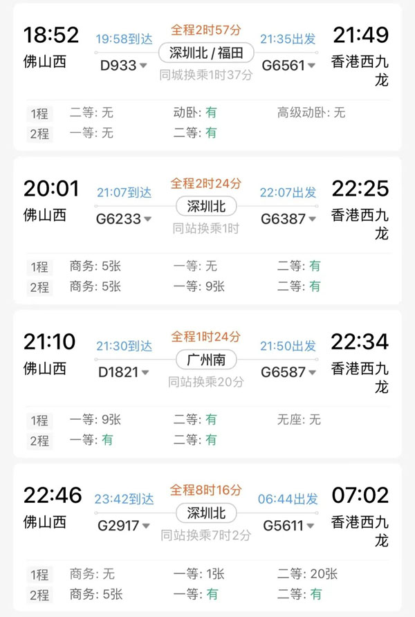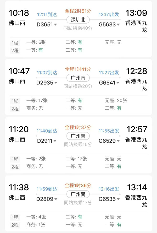 包括直达和中转方案,目前有21趟列车可从狮山前往香港,各位街坊可通过铁路12306网站或手机APP购票。