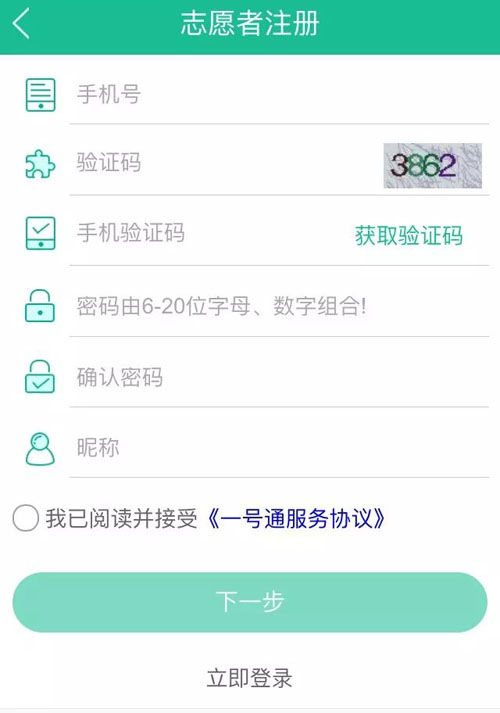 第二步:进入志愿者注册页面,进入用户注册页面,输入手机号码、密码、昵称等信息完成一号通账号注册。