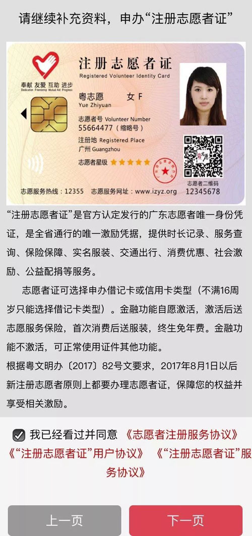 第四步:填写申请志愿者证的资料,可选择申请借记卡或信用卡。